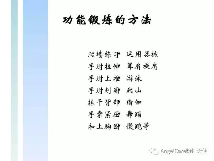 平日也可适量增加一些手臂的康复运动,但不建议采取快速的、高强度的活动。例如高尔夫、网球、跑步、足球等,他们会加重淋巴水肿。相比较而言,走路、游泳、水中有氧运动(建议水温28℃左右)、低强度力量训练、骑车等更安全也更有效。
