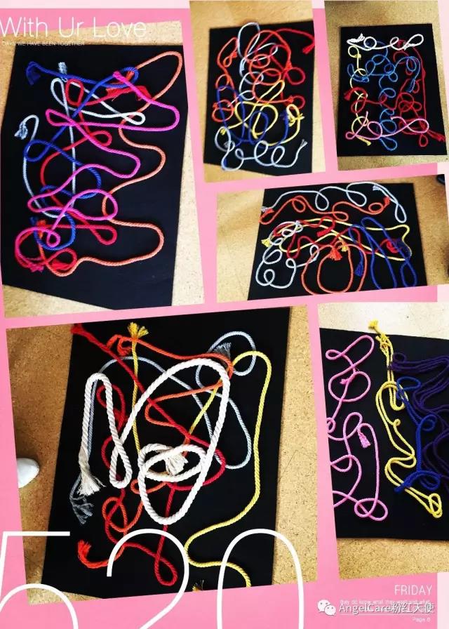 最后一节课上,老师还让我们随着音符,用手中的彩绳在黑色的画板上作画,看我们的作品是不是颇有毕加索大师的风范?!