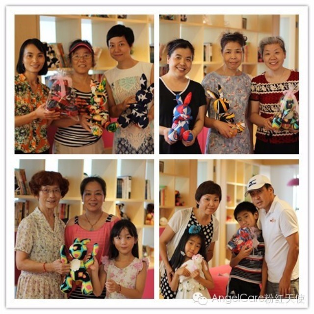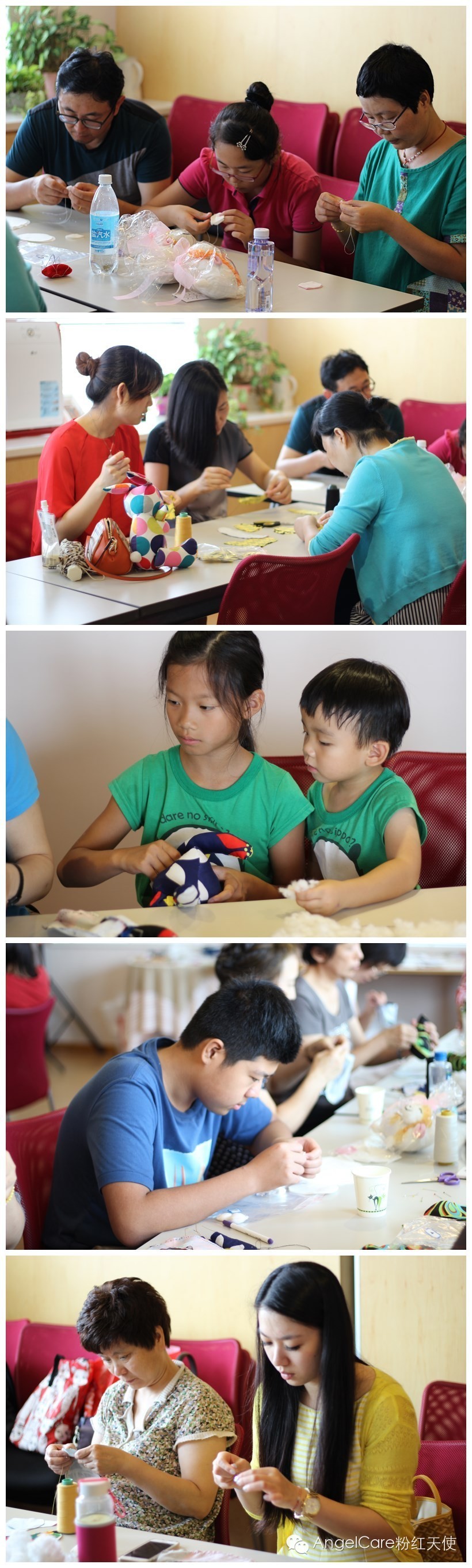 2015年是天使关爱金项目成立的第二个年头,为着来沪打工的年轻的贫困病人募集治疗费用,越来越多的康复病友和满有爱心的社会人士走进了粉红天使这个平台。天使奶奶,天使妈妈,天使姐姐带着小天使们一针一线忙的不亦乐乎,天使爸爸也亲自上阵,跟着天使奶奶学做针线,缝布,装棉花,虽不够麻利每一针都是爱心牌喔!